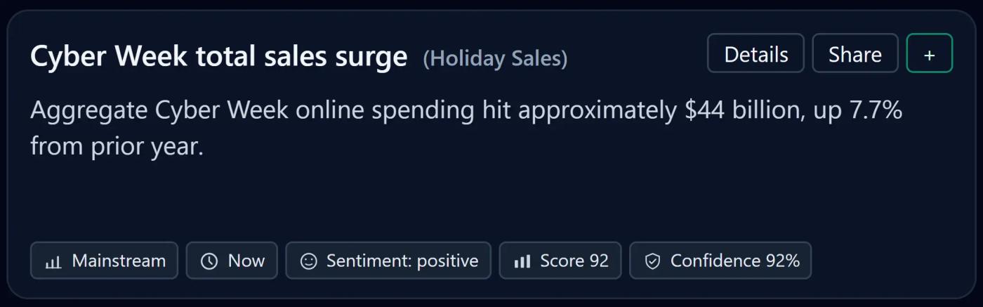 Cyber Week spending hit $44 billion, up 7.7% from last year. Consumers are extending shopping into a full-week cycle rather than concentrating on a single day.