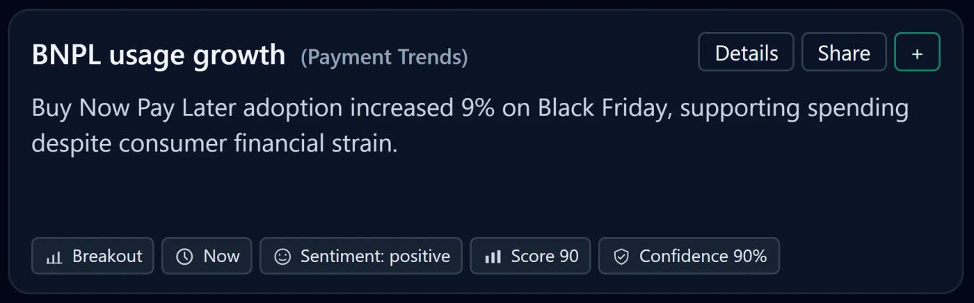 Buy Now Pay Later adoption grew 9% year-over-year during Black Friday, providing financial flexibility amid consumer budget constraints.