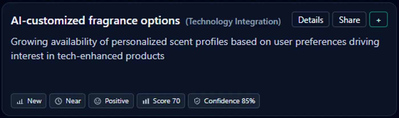 AI-driven fragrance personalization is moving from experiment to product. Machine-learning systems are now being used to generate custom scent profiles based on user preferences, mood inputs, or biometric data. Large fragrance houses like Givaudan and dsm-firmenich are actively investing in AI-assisted scent creation, while projects like Philyra, developed with IBM, demonstrate how algorithmic perfumery can operate at scale.