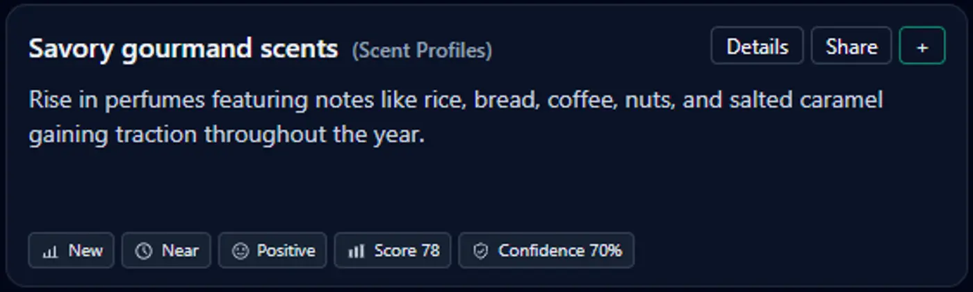 The underlying shift is consumer fatigue. Sweet gourmands have become predictable, opening space for bitterness, savoriness, and culinary realism. Platforms like Fragrantica show growing discussion around savory profiles as collectors search for novelty.
